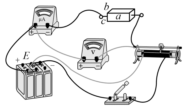 (2)进一步提高实验精度,使用伏安法测量水泥块电阻,电源 E 电动势 6 V,内阻可忽略,电压表量程 0 ~ 6 V,内阻约 10 kΩ,电流表程 0 ~ 600 μA,内阻约 100 Ω。实验中要求滑动变阻器采用分压接法,在图 2 中完成余下导线的连接__________。