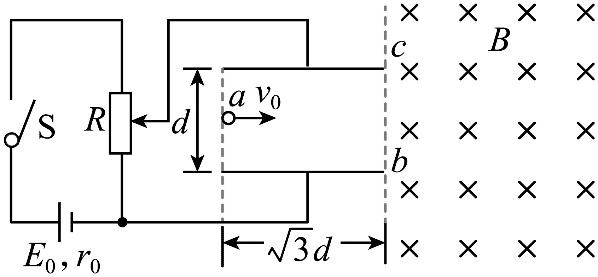 14.如图。直流电源的电动势为 E0,内阻为 r0,滑动变阻器 R 的最大阻值为 2r0,平行板电容器两极板水平放置,板间距离为 d,板长为 \(\sqrt 3 \)d,平行板电容器的右侧存在方向垂直纸面向里的匀强磁场。闭合开关 S,当滑片处于滑动变阻器中点时,质量为 m 的带正电粒子以初速度 v0 水平向右从电容器左侧中点 a 进入电容器,恰好从电容器下极板右侧边缘 b 点进入磁场,随后又从电容器上极板右侧边缘 c 点进入电容器,忽略粒子重力和空气阻力。