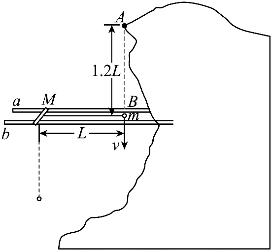 15.某地为发展旅游经济,因地制宜利用山体举办了机器人杂技表演。表演中,需要将质量为 m 的机器人抛至悬崖上的 A 点,图为山体截面与表演装置示意图。a、b 为同一水平面上两条光滑平行轨道,轨道中有质量为 M 的滑杆。滑杆用长度为 L 的轻绳与机器人相连。初始时刻,轻绳绷紧且与轨道平行,机器人从 B 点以初速度 v 竖直向下运动,B 点位于轨道平面上,且在 A 点正下方,AB = 1.2L。滑杆始终与轨道垂直,机器人可视为质点且始终作同一竖直平面内运动,不计空气阻力,轻绳不可伸长,sin37° = 0.6,重力加速度大小为 g。