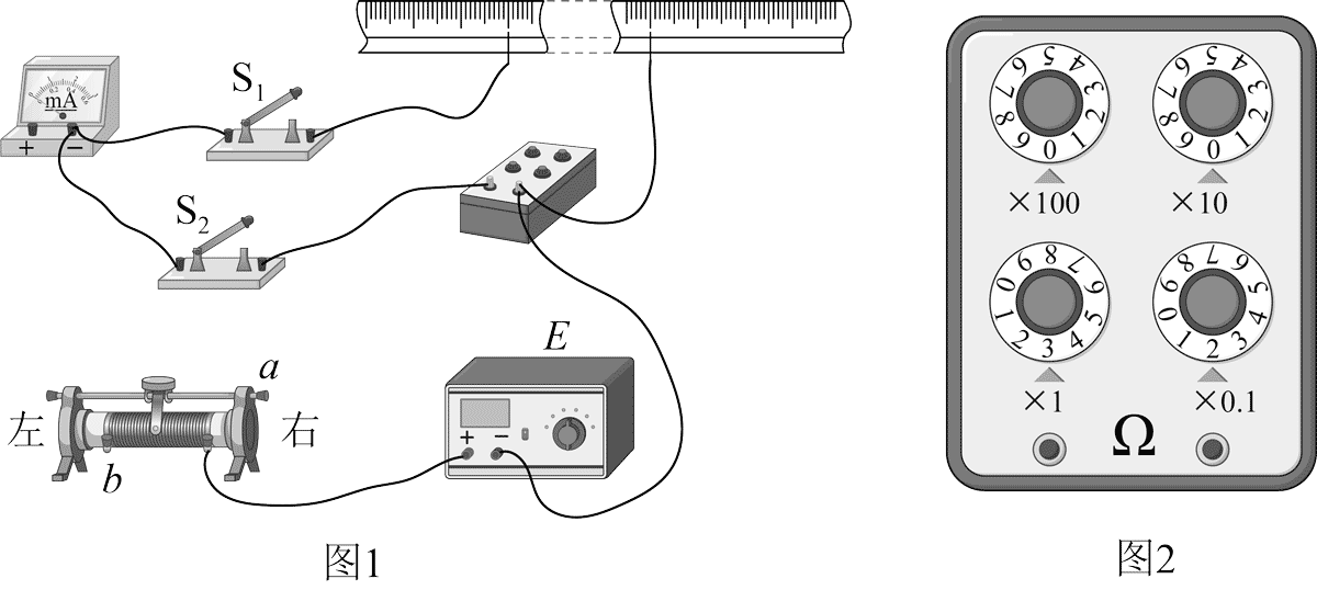 (3)断开 S2、闭合 S1,调节滑动变阻器使电流表指针恰好指到 15.0 mA 刻度处。断开 S1、闭合 S2,保持滑动变阻器滑片位置不变,旋转电阻箱旋钮,使电流表指针仍指到 15.0 mA 处,此时电阻箱面板知图2所示,则该合金丝的电阻率为_________Ω·m(取 π = 3.14,结果保留 2 位有效数字)。