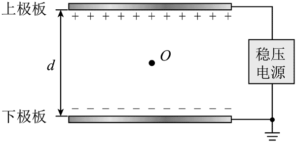 13.如图所示,真空中固定放置两块较大的平行金属板,板间距为 d,下极板接地,板间匀强电场大小恒为 E。现有一质量为 m、电荷量为 q(q > 0)的金属微粒,从两极板中央 O 点由静止释放。若微粒与极板碰撞前后瞬间机械能不变,碰撞后电性与极板相同,所带电荷量的绝对值不变。不计微粒重力。求:
