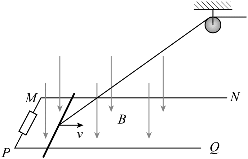 14.如图所示,长度均为 s 的两根光滑金属直导轨 MN 和 PQ 固定在水平绝缘桌面上,两者平行且相距 l,M、P 连线垂直于导轨,定滑轮位于 N、Q 连线中点正上方 h 处。MN 和 PQ 单位长度的电阻均为 r,M、P 间连接一阻值为 2sr 的电阻。空间有垂直于桌面向下的匀强磁场,磁感应强度大小为 B。过定滑轮的不可伸长绝缘轻绳拉动质量为 m、电阻不计的金属杆沿导轨向右做匀速直线运动,速度大小为 v。零时刻,金属杆位于 M、P 连线处。金属杆在导轨上时与导轨始终垂直且接触良好,重力加速度大小为 g。