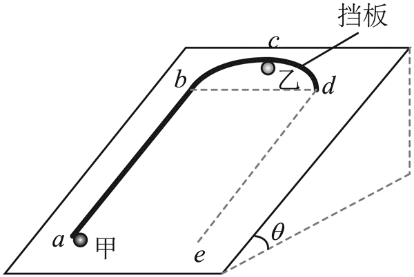 15.如图所示,倾角为 θ 的斜面固定于水平地面,斜面上固定有半径为 R 的半圆挡板和长为 7R 的直挡板。a 为直挡板下端点,bd 为半圆挡板直径且沿水平方向,c 为半圆挡板最高点,两挡板相切于 b 点,de 与 ab 平行且等长。小球乙被锁定在 c 点。小球甲从 a 点以一定初速度出发,沿挡板运动到 c 点与小球乙发生完全弹性碰撞,碰撞前瞬间解除对小球乙的锁定,小球乙在此后的运动过程中无其他碰撞。小球甲质量为 m1,两小球均可视为质点,不计一切摩擦,重力加速度大小为 g。