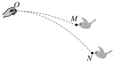3.如图所示,某同学将两颗鸟食从 O 点水平抛出,两只小鸟分别在空中的 M 点和 N 点同时接到鸟食。鸟食的运动视为平抛运动,两运动轨迹在同一竖直平面内,则 ( )