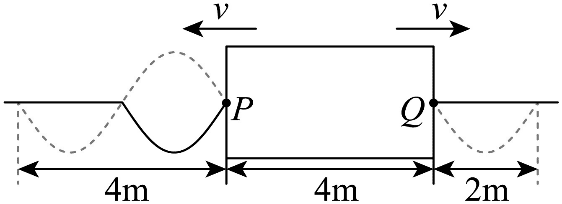 7.如图所示,均匀介质中矩形区域内有一位置未知的波源。t = 0 时刻,波源开始振动产生简谐横波,并以相同波速分别向左、右两侧传播,P、Q 分别为矩形区域左右两边界上振动质点的平衡位置。t = 1.5 s 和 t = 2.5 s 时矩形区域外波形分别如图中实线和虚线所示,则( )