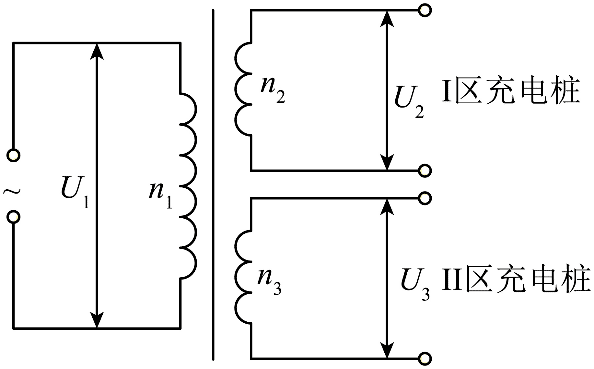 8.电动汽车充电桩的供电变压器(视为理想变压器)示意图如图所示。变压器原线圈的匝数为 n1,输入电压 U1 = 1.1 kV;两副线圈的匝数分别为 n2 和 n3,输出电压 U2 = U3 = 220 V。当 I、Ⅱ 区充电桩同时工作时,两副线圈的输出功率分别为 7.0 kW 和 3.5 kW,下列说法正确的是( )