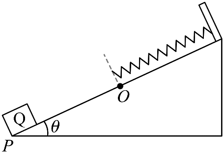 10.如图所示,倾角为 θ 的固定斜面,其顶端固定一劲度系数为 k 的轻质弹簧,弹簧处于原长时下端位于 O 点。质量为 m 的滑块 Q(视为质点)与斜面间的动摩擦因数 μ = tanθ。过程 Ⅰ:Q 以速度 v0 从斜面底端 P 点沿斜面向上运动恰好能滑至 O 点;过程 Ⅱ:将 Q 连接在弹簧的下端并拉至 P 点由静止释放,Q 通过 M 点(图中未画出)时速度最大,过 O 点后能继续上滑。弹簧始终在弹性限度内,假设最大静摩擦力等于滑动摩擦力,忽略空气阻力,重力加速度为 g。则( )