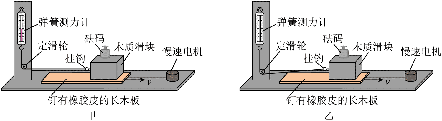 11.某实验小组做了测量木质滑块与橡胶皮之间动摩擦因数 μ 的实验,所用器材如下:钉有橡胶皮的长木板、质量为 250 g 的木质滑块(含挂钩)、细线、定滑轮、弹簧测力计、慢速电机以及砝码若干。实验装置如图甲所示。