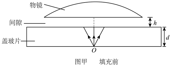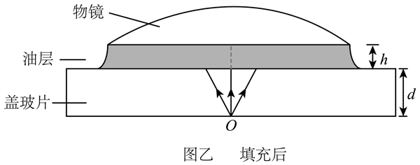 13.用光学显微镜观察样品时,显微镜部分结构示意图如图甲所示。盖玻片底部中心位置 O 点的样品等效为点光源,为避免 O 点发出的光在盖玻片上方界面发生全反射,可将盖玻片与物镜的间隙用一滴油填充,如图乙所示。已知盖玻片材料和油的折射率均为 1.5,盖玻片厚度 d = 2.0 mm,盖玻片与物镜的间距 h = 0.20 mm,不考虑光在盖玻片中的多次反射,取真空中光速 c = 3.0×108 m/s,π = 3.14。