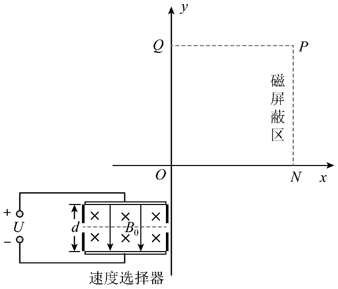 14.磁屏蔽技术可以降低外界磁场对屏蔽区域的干扰。如图所示,x ≥ 0 区域存在垂直 Oxy 平面向里的匀强磁场,其磁感应强度大小为 B1(未知)。第一象限内存在边长为 2L 的正方形磁屏蔽区 ONPQ,经磁屏蔽后,该区域内的匀强磁场方向仍垂直 Oxy 平面向里,其磁感应强度大小为 B2(未知),但满足 0 < B2 < B1。某质量为 m、电荷量为 q(q > 0)的带电粒子通过速度选择器后,在 Oxy 平面内垂直 y 轴射入 x ≥ 0 区域,经磁场偏转后刚好从 ON 中点垂直 ON 射入磁屏蔽区域。速度选择器两极板间电压 U、间距 d、内部磁感应强度大小 B0 已知,不考虑该粒子的重力。
