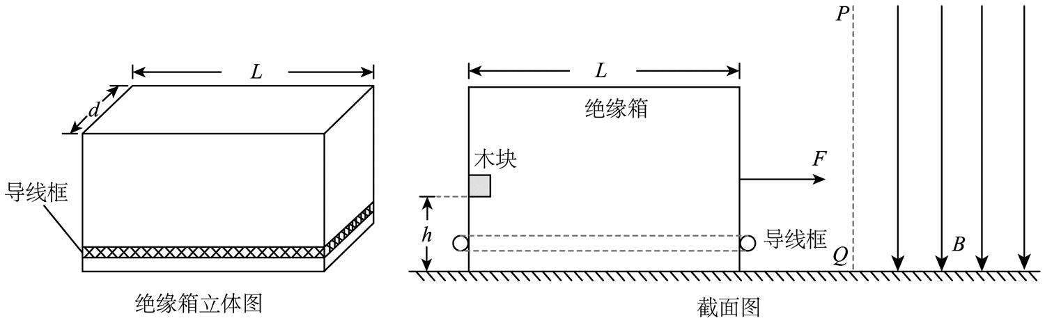 15.如图所示,光滑水平面上有一个长为 L、宽为 d 的长方体空绝缘箱,其四周紧固一电阻为 R 的水平矩形导线框,箱子与导线框的总质量为 M。与箱子右侧壁平行的磁场边界平面如截面图中虚线 PQ 所示,边界右侧存在范围足够大的匀强磁场,其磁感应强度大小为 B、方向竖直向下。t = 0 时刻,箱子在水平向右的恒力 F(大小未知)作用下由静止开始做匀加速直线运动,这时箱子左侧壁上距离箱底 h 处、质量为 m 的木块(视为质点)恰好能与箱子保持相对静止。箱子右侧壁进入磁场瞬间,木块与箱子分离;箱子完全进入磁场前某时刻,木块落到箱子底部,且箱子与木块均不反弹(木块下落过程中与箱子侧壁无碰撞);木块落到箱子底部时即撤去 F。运动过程中,箱子右侧壁始终与磁场边界平行,忽略箱壁厚度、箱子形变、导线粗细及空气阻力。木块与箱子内壁间的动摩擦因数为 μ,假设最大静摩擦力等于滑动摩擦力,重力加速度为 g。