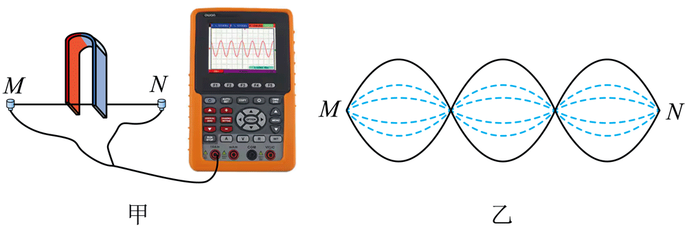10.如图甲所示,有一根长 1 m、两端固定紧绷的金属丝,通过导线连接示波器。在金属丝中点处放置一蹄形磁铁,在中点附近 1.00 cm 范围内产生 B = 10−3 T、方向垂直金属丝的匀强磁场(其他区域磁场忽略不计)。现用一激振器使金属丝发生垂直于磁场方向的上下振动,稳定后形成如图乙所示的不同时刻的波形,其中最大振幅 A = 0.5 cm。若振动频率为f,则振动最大速度 v = 2πfA。已知金属丝接入电路的电阻 r = 0.5 Ω,示波器显示输入信号的频率为 150 Hz。下列说法正确的是( )
