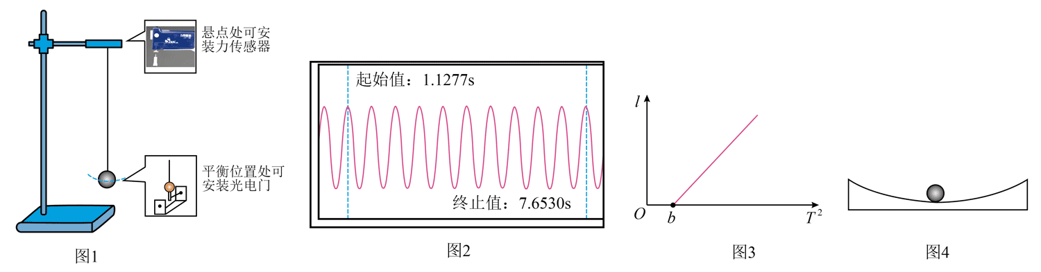 (1)如图 1 所示,可在单摆悬点处安装力传感器,也可在摆球的平衡位置处安装光电门。甲同学利用力传感器,获得传感器读取的力与时间的关系图像,如图 2 所示,则单摆的周期为___________s(结果保留 3 位有效数字)。乙同学利用光电门,从小钢球第 1 次遮光开始计时,记下第 n 次遮光的时刻 t,则单摆的周期为 T =___________;