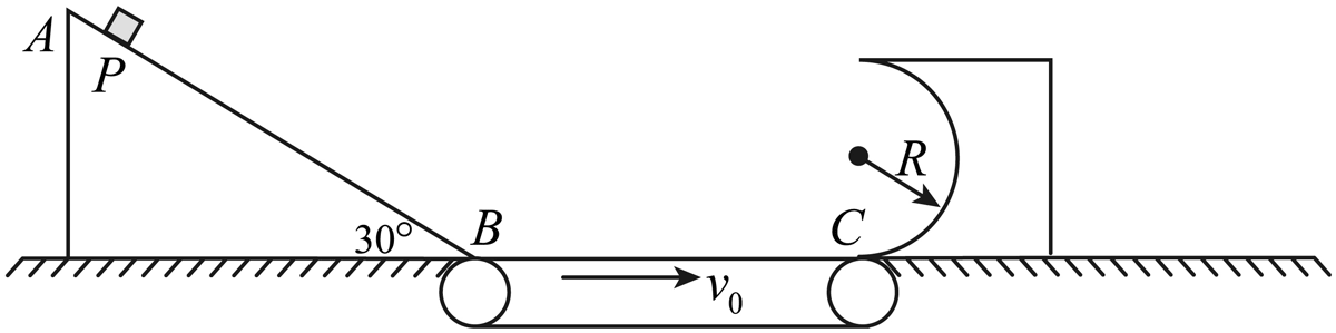 16.某兴趣小组设计了一传送装置,其竖直截面如图所示。AB 是倾角为 30° 的斜轨道,BC 是以恒定速率 v0 顺时针转动的水平传送带,紧靠 C 端有半径为 R、质量为 M 置于光滑水平面上的可动半圆弧轨道,水平面和传送带 BC 处于同一高度,各连接处平滑过渡。现有一质量为 m 的物块,从轨道 AB 上与 B 相距 L 的 P 点由静止下滑,经传送带末端 C 点滑入圆弧轨道。物块与传送带间的动摩擦因数为 μ,其余接触面均光滑。已知 R = 0.36 m,L = 1.6 m,v0 = 5 m/s,m = 0.2 kg,M = 1.8 kg,μ = 0.25。不计空气阻力,物块可视为质点,传送带足够长。求物块