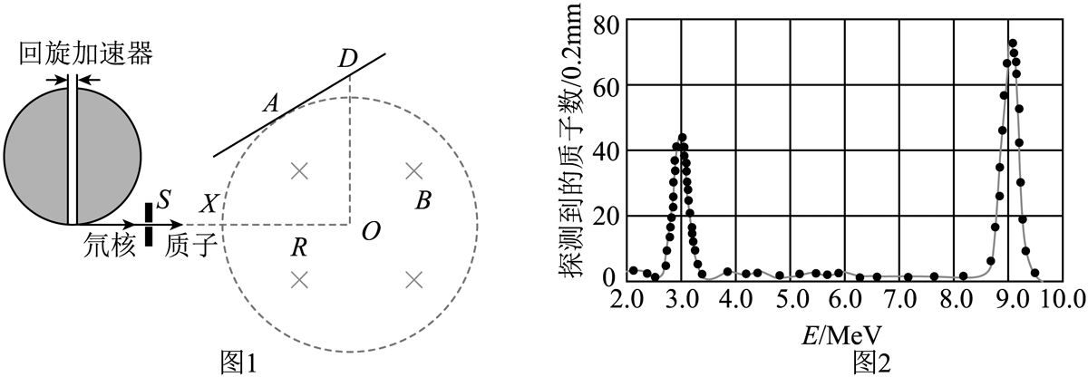 18.利用磁偏转系统可以测量不同核反应中释放的高能粒子能量,从而研究原子核结构。如图 1 所示,用回旋加速器使氘原子核(21H)获得 2.74 MeV 动能,让其在 S 处撞击铝(2713Al)核发生核反应,产生处于某一激发态和基态的同位素核(2813Al)以及两种不同能量的质子(11H)。产生的质子束经狭缝X沿水平直径方向射入半径为 R,方向垂直纸面向里、大小为 B 的圆形匀强磁场区域,经偏转后打在位于磁场上方的探测板上 A、D 处(探测板与磁场边界相切于 A 点,D 点与磁场圆心 O 处在同一竖直线上),获得如图 2 所示的质子动能的能谱。