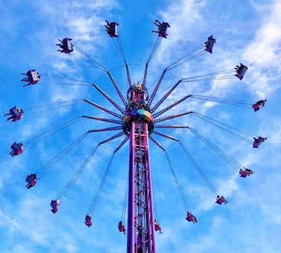 一种名为“飞椅”的游乐设施如图所示,该设施中钢绳一端系着座椅,另一端系在悬臂边缘。绕竖直轴转动的悬臂带动座椅在水平面内做匀速圆周运动,座椅可视为质点,则某座椅运动一周的过程中( )