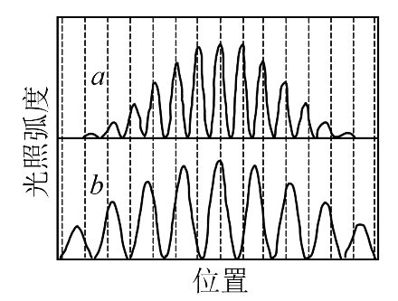 在进行双缝干涉实验时,用光传感器测量干涉区域不同位置的光照强度,可以方便地展示干涉条纹分布。a、b 两束单色光分别经过同一双缝干涉装置后,其光照强度与位置的关系如图所示,图中光照强度极大值位置对应亮条纹中心,极小值位置对应暗条纹中心,上下两图中相同横坐标代表相同位置,则( )