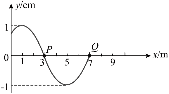 位于坐标原点的波源从平衡位置开始沿 y 轴运动,在均匀介质中形成了一列沿 x 轴正方向传播的简谐波,P 和 Q 是平衡位置分别位于 x = 3 m 和 x = 7 m 处的两质点,t = 0 时波形如图所示,此时 Q 刚开始振动,t = 1 s 时 Q 第一次到达波谷。则( )