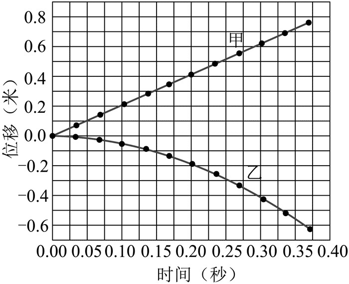 (2)利用手机和计算机可以方便地记录钢球做平抛运动的轨迹并分析其运动规律。该实验小组利用视频处理软件分析钢球某次平抛运动的录制视频,得到的水平位移和竖直位移随时间变化的图像如图所示。图中图线___________(选填“甲”或“乙”)为水平位移随时间变化的图线,此次钢球做平抛运动的初速度为___________米/秒。