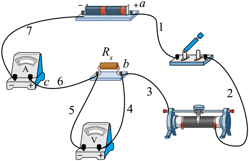 (2)该同学连接好的电路如下图所示,闭合开关后,电流表和电压表的读数均为零,经排查,发现电路中的七条导线中混进了一条内部断开的导线。为了确定哪条导线断开,该同学用多用电表的直流电压挡测量电源正极 a 与接线柱 b 间电压,读数为零;测量 a 与接线柱 c 间电压,读数不为零,则可以确定导线___________内部断开(填图中导线编号);