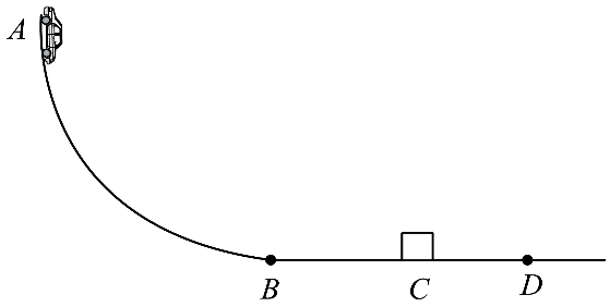 如图所示,半径为 R = 0.45 m 的四分之一圆轨道AB竖直固定放置,与水平桌面在 B 点平滑连接。质量为 m = 0.12 kg 的玩具小车从 A 点由静止释放,运动到桌面上 C 点时与质量为 M = 0.18 kg 的静置物块发生碰撞并粘在一起,形成的组合体匀减速滑行 x = 0.20 m 至 D 点停止。A 点至 C 点光滑,小车和物块碰撞时间极短,小车、物块及组合体均视为质点,g 取 10 m/s2,不计空气阻力。求: