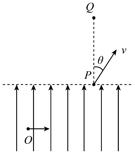 如图所示,纸面内水平虚线下方存在竖直向上的匀强电场,虚线上方存在垂直于纸面的匀强磁场。一质量为 m、电荷量为 q 的粒子从电场中的 O 点以水平向右的速度开始运动,在静电力的作用下从 P 点进入磁场,射入磁场时的速度大小为 v、方向与竖直方向夹角为 θ,粒子返回电场前的运动轨迹过 P 点正上方的 Q 点,P、Q 间距离及 O、P 间的水平距离均为 L。不计粒子重力。