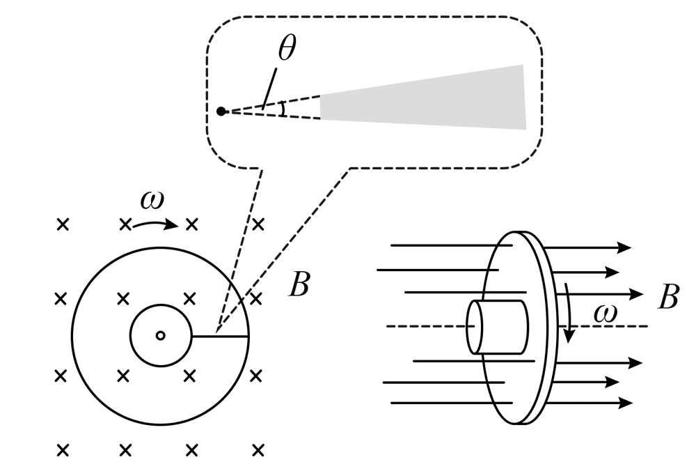 (2)若外电阻阻值为 R,导体盘电阻忽略不计、内半径为 l,通过导体盘上相同圆心角区域内的电流相同。求作用在导体盘上圆心角为 θ 区域(θ 很小,可视为导体棒)上的安培力大小 F 与 θ 的关系式;