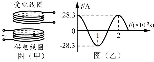 2.(多选)新能源汽车也可无线充电。与蓄电池相连的受电线圈置于车底,汽车停在地面供电线圈正上方即可充电。供电线圈通入图(乙)所示的正弦交流电,线圈两端电压 U = 220 V,下列说法正确的是( )