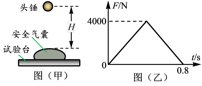 3.车辆发生碰撞时,安全气囊会自动弹出,接触乘员后通过排气孔缓慢放气,柔性吸收能量并缓冲乘员。图(甲)为气囊的简易测试装置,质量 m = 80 kg、可视为质点的头锤从离气囊表面高度 H = 5.0 m 处自由下落,与正下方的气囊发生碰撞。触及气囊即开始计时,气囊对头锤竖直方向作用力 F 随时间 t 的变化规律如图(乙)所示。不计空气阻力,g 取 10 m/s2。则碰撞过程中,气囊吸收头锤动量的大小 ∆p = _______kg·m/s;气囊吸收头锤的动能 ∆Ek = __________J。