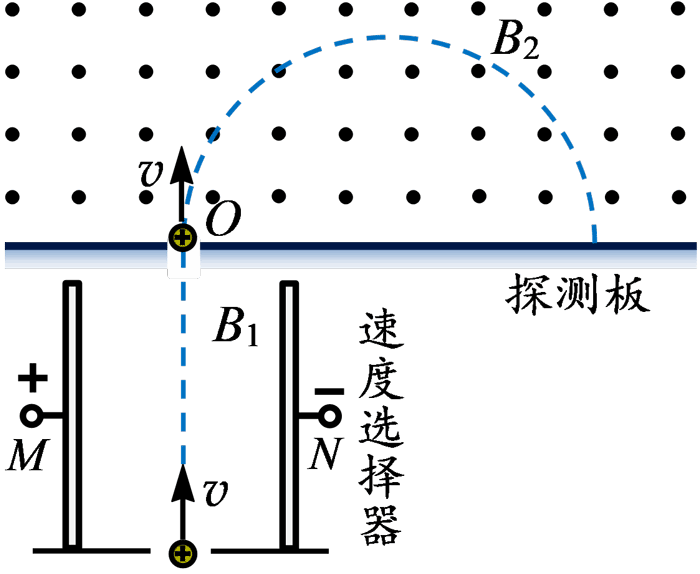 3.离子注入前需经磁分析器筛选,磁分析器的一部分结构如图所示。B+ 和 B2+ 离子通过速度选择器后,速度为 v 的离子可由狭缝 O 沿与磁场垂直的方向进入磁感应强度为 B2 的匀强磁场,最终射到右侧的探测板上。已知两种离子的质量均为 m,元电荷为 e,不考虑离子受到的重力和离子间相互作用。