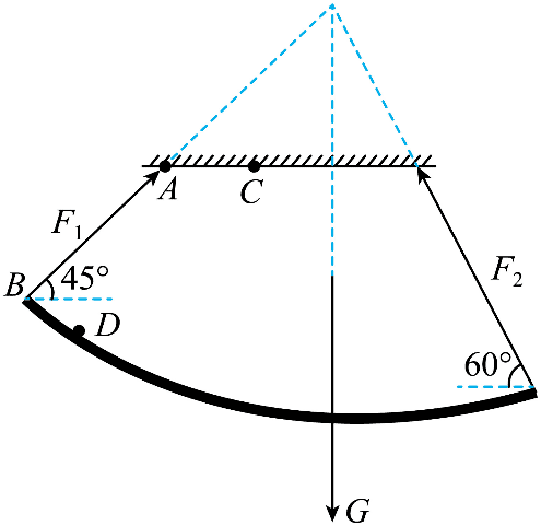 如图所示,一盏重为 G 的艺术灯用细绳悬挂,左右两侧细绳与水平方向夹角分别为 45° 和 60°,细绳拉力分别为 F1 和 F2。A 和 B 是左侧细绳两端点,C 和 D 分别是天花板和灯上的点,CD 与 AB 平行,则( )