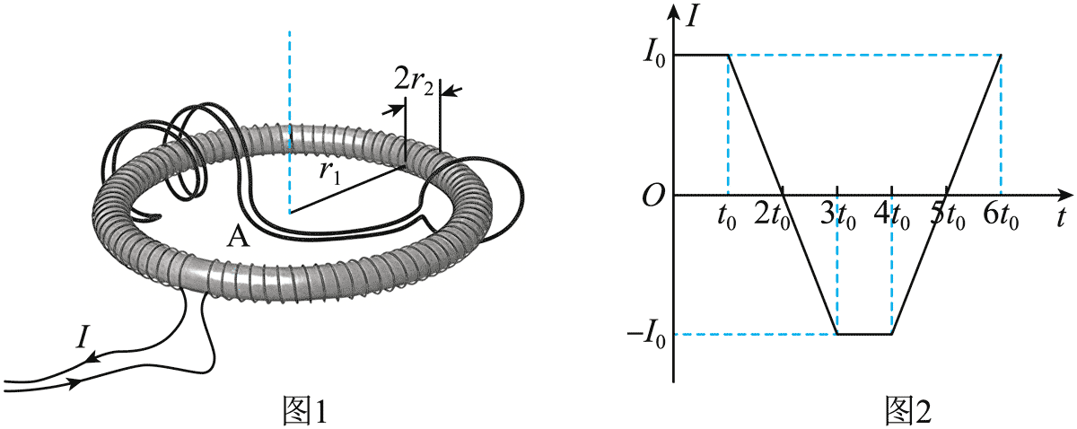 10.如图 1 所示,半径为 r1、横截面半径为 r2(r2 ≪ r1)、匝数为 N 的圆环形螺线管通有电流 I,管内产生磁感应强度 B = aI(a 为常量)的匀强磁场。管外磁场近似为 0,小明用电阻为 R 的一段漆包线缠绕螺线管一圈后,并成双股线再缠绕螺线管两圈,最后将两端头短接,形成特殊线圈 A。若电流 I 随时间 t 变化的关系如图 2 所示,则( )