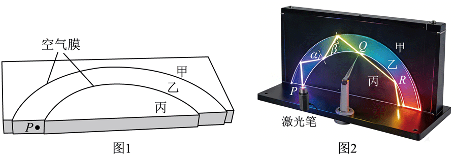 12.如图 1 所示,三块同质有机玻璃板甲、乙、丙,拼接形成两层同心圆弧空气膜。现让一束激光从 P 点射入,并在空气膜 Q 处注入一滴油,呈现图 2 所示的光路(其中 α、β 为相应光线的入射角)。已知空气折射率为 1,光在空气中的传播速度为 c。下列说法正确的是( )