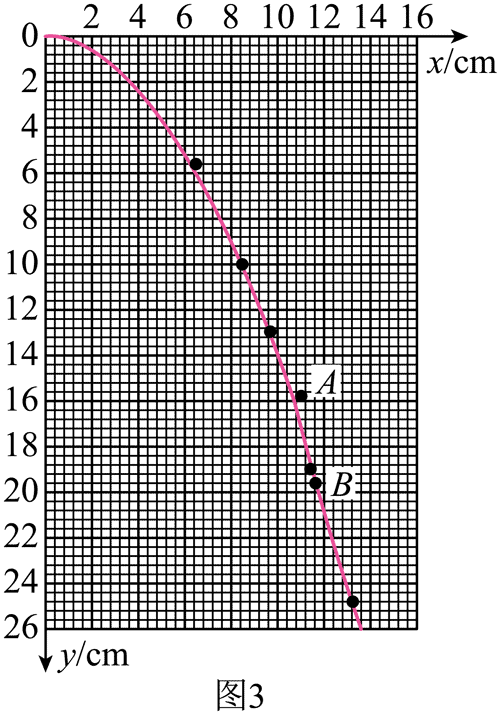 (3)如图 3 所示,将实验中记录的印迹用平滑曲线连接,其中抛出点为坐标原点,A 点(11.0 cm,15.8 cm)是记录的印迹,B 点(11.8 cm,19.6 cm)是曲线上的一个点,为得到小球的水平速度,应取________(选填“A”或“B”)点进行计算,可得水平速度 v0 =________m/s。(g 取 9.8 m/s2,所得结果保留两位有效数字)