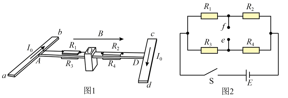 16.测量局域磁场,科学家基于电阻应变片开发出一种磁场检测芯片,其简化结构如图 1 所示。长度均为 l、通有恒定电流 I0。(方向相反)的两刚性金属杆 ab、cd,与具有良好弹性的绝缘悬梁 OA、OD 构成“H”形支架,对称固定于底座 O 处。在悬梁上、下表面对称安装四个相同的电阻应变片(各自引出两导线),其阻值分别为 R1、R2、R3 和 R4,将它们按图 2 方式与电动势为 E 的电源(不计内阻)相连。未加磁场时,支架处于水平平衡状态, 此时 R1 = R2 = R3 = R4 = R0,测得 e、f 两端的电势差为 0。现施加待测磁场,其方向水平向右、且垂直于金属杆,则金属杆 ab、cd 受安培力作用,使悬梁 OA、OD 产生形变,四个应变片的阻值发生相应变化,其变化量的绝对值均为 ΔR,此时测得 e、f 两端的电势差为 Uef,从而得到待测磁场磁感应强度 B 的大小。