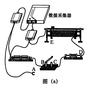 (1)将待测电池组、滑动变阻器、电流传感器、电压传感器、定值电阻、电键及若干导线连接成电路如图(a)所示,图中未接导线的 A 端应接在________点(选填:“B”、“C”、“D”或“E”)。