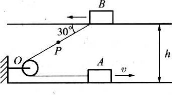 如图所示,有两条位于同一竖直平面内的水平轨道,相距为h。轨道上有两个物体A和B,它们通过一根绕过定滑轮O的不可伸长的轻绳相连接。物体A在下面的轨道上以匀速率v运动。在轨道间的绳子与轨道成30°角的瞬间,绳子BO段的中点处有一与绳相对静止的小水滴P与绳子分离,设绳长BO远大于滑轮直径,求: