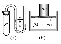 8.如图所示,(a)中U形管内液面高度差为h,液体密度为ρ,大气压强为p0,此时容器内被封闭气体的压强p1为______________;(b)中内壁光滑的气缸放置在水平桌面上,活塞的质量为m1,底面积为S,在活塞上再放置一个质量为m2的金属块,大气压强为p0,则气缸内被封闭气体的压强p2为_________________。(已知重力加速度为g)