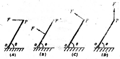 21.长为L、重为G的均匀木棒OP,可绕O轴自由转动,在力F作用下处于平衡状态,棒与地面成θ角。图中四种情况中F最小的是( )