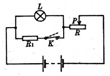28.如图所示,电池组的电动势和内电阻不变,R1是定值电阻,电键K断开时,电灯L能正常发光,当K闭上后,要使电灯L仍能正常发光,滑动变阻器R的滑动片P应( )